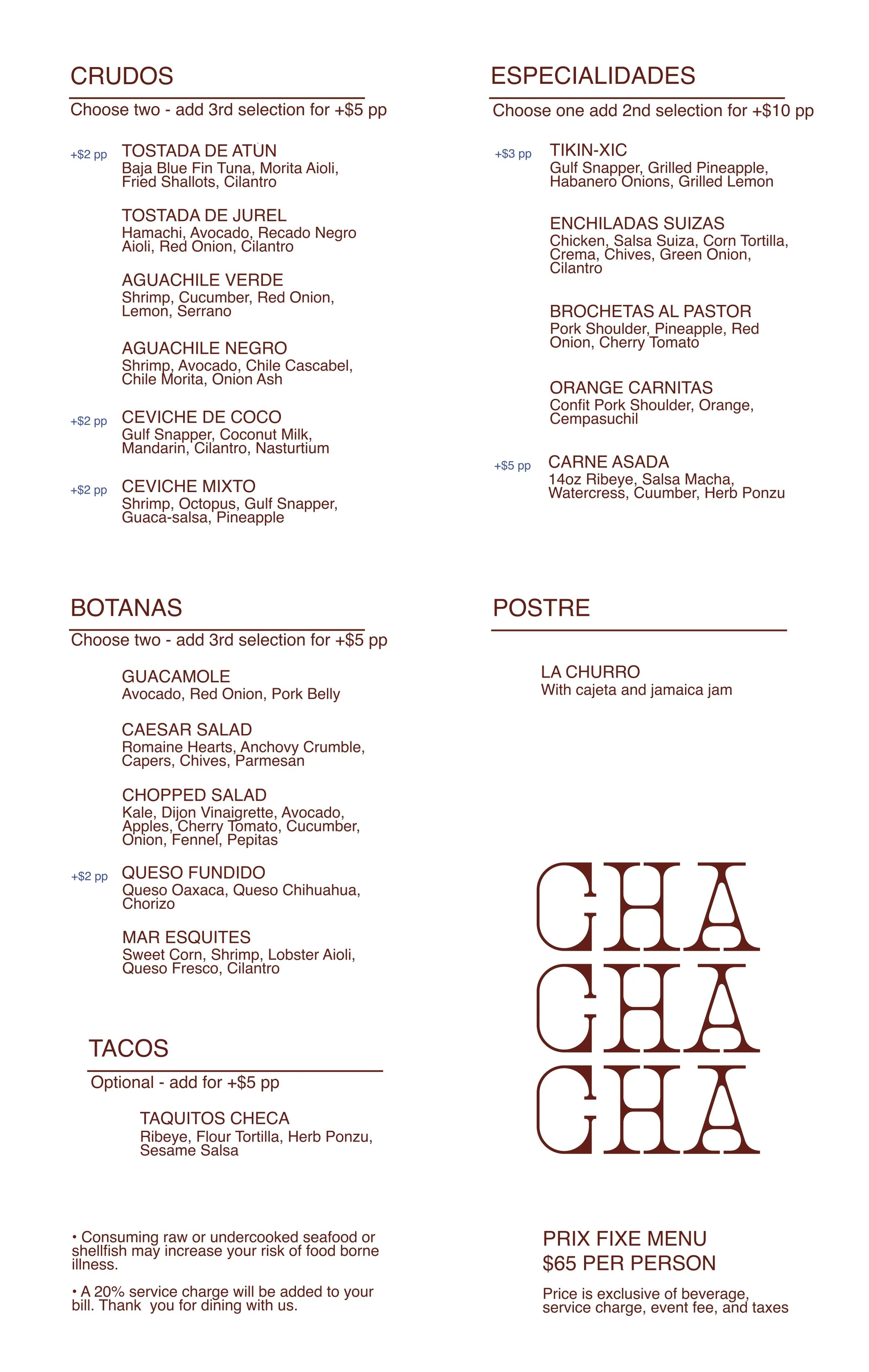 Our Prix Fixe Menu Groups over 12, please contactreservations@chachacha.miami Contact Us reservations@chachacha.miami